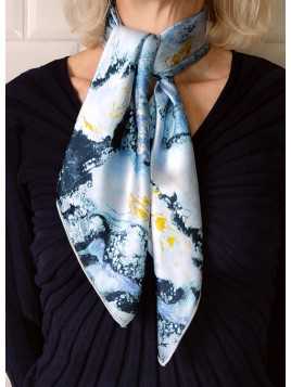 Prix 75,90 €-FOULARD-CARRE-SOIE-FEMME-2465 "Vagues Bleutées" Le carré...
