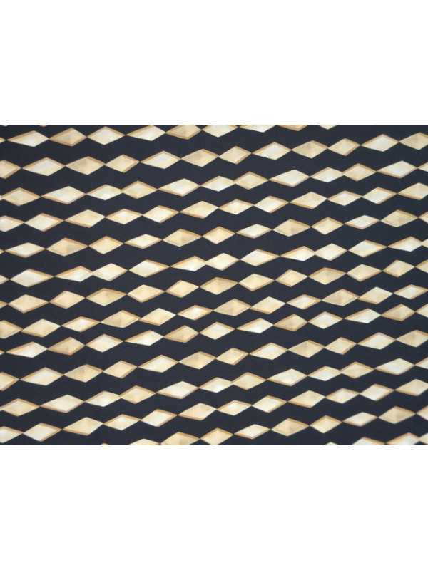 Le modèle “Éclat Graphique” revisite l’esprit Art déco avec audace et modernité. Le contraste assumé entre les losanges beige doré et le fond noir crée un effet visuel structuré, presque architectural. Ce carré évoque la sophistication des parures des années 30, tout en s’inscrivant dans un registre contemporain. À travers son motif répétitif et lumineux, il attire l’œil tout en s’harmonisant parfaitement avec un vestiaire sobre ou minimaliste.