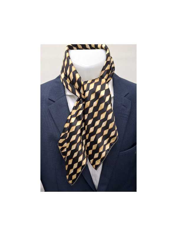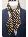 La soie choisie pour ce modèle est particulièrement lumineuse. Le tissage offre une brillance discrète mais présente, qui joue avec les teintes dorées du motif. La qualité du tissu, toujours d’origine européenne, confère à l’ensemble une texture lisse et fluide. La coupe parfaite et la finition bourdon assurent une excellente tenue, même après de nombreux ports.