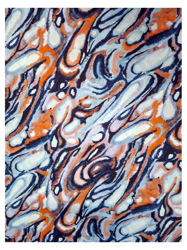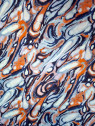 Le carré de soie "Écume Ardent" s’inscrit dans une esthétique résolument contemporaine où l’émotion visuelle naît d’un motif abstrait aux lignes tourbillonnantes. Il semble capturer l’instant où l’eau et le feu s’entrelacent dans une danse hypnotique, évoquant à la fois les nervures d’un marbre rare et les mouvements d’un ciel en tempête.