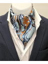 Les couleurs jouent ici un rôle fondamental. Le bleu profond, presque encre, dialogue avec des oranges vibrants, des nuances de sable chaud et quelques éclats d’ivoire nacré. Cette palette contrastée, travaillée avec une technique d’impression de haute qualité, confère à la soie une richesse visuelle exceptionnelle. Chaque volute, chaque dégradé, est reproduit avec une précision minutieuse, renforçant la sensation d’un tableau vivant.
