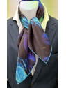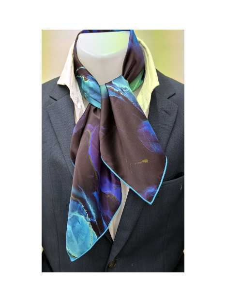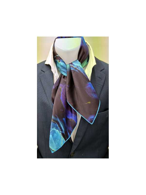 ILe carré "Abîmes Turquoises" se révèle comme une peinture en mouvement, inspirée des profondeurs marines et de leurs jeux de lumière. Le motif tie and dye, à la fois fluide et structuré, unit les bleus électriques, les turquoises cristallins, les violets diffus et les verts minéraux dans une composition riche en nuances.