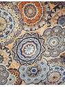 Ce motif trouve son inspiration dans les mandalas orientaux, ces figures symboliques représentant l'univers et la quête d’harmonie intérieure. Le choix du cuivre, couleur noble et solaire, associé au bleu profond, symbole de sérénité et d’élégance, confère à cette écharpe une dimension spirituelle et contemporaine. Les contours nets des cercles, rehaussés par des micro-détails évoquant la dentelle ou la mosaïque, renforcent cette impression d’équilibre parfait entre tradition et design.