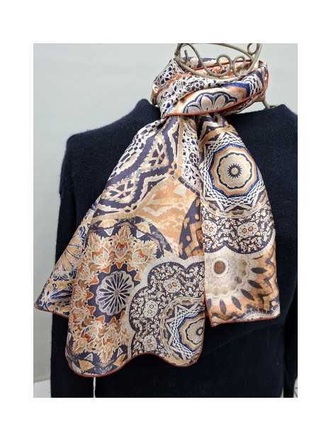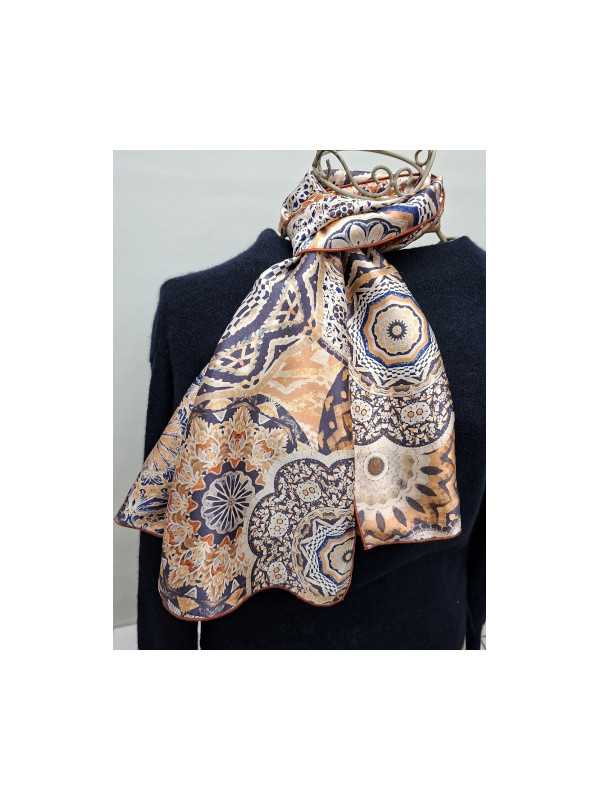L’écharpe en soie "Mandala de Cuivre" séduit par l’élégance hypnotique de ses cercles ornementaux inspirés des mandalas. Le bleu profond s’unit à la chaleur du cuivre, sublimé par des motifs géométriques minutieusement travaillés, comme de délicates dentelles. Chaque cercle semble danser en lévitation sur un fond clair, tel un vitrail stylisé au fil d'une brise légère. Ce design raffiné évoque à la fois la force des traditions orientales et la modernité graphique.