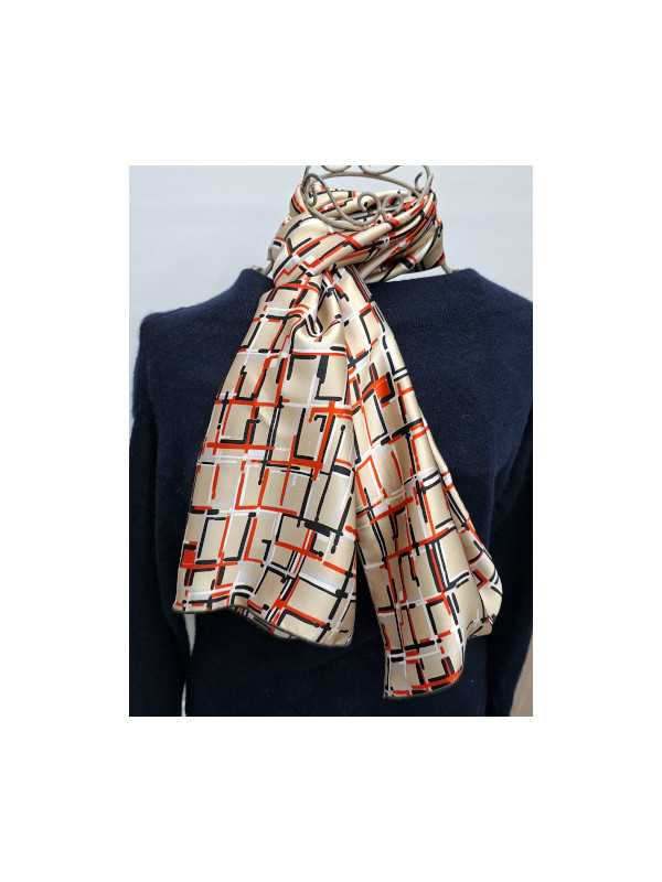 L’écharpe en soie "Rythme Urbain" traduit l’énergie de la ville dans un motif géométrique vibrant. Des lignes rouges, noires et blanches s’entrelacent en un quadrillage moderne sur fond beige, créant une dynamique captivante. Ce design structuré et contemporain en fait un accessoire affirmé, aussi élégant en journée qu’en soirée. Grâce à son impression de haute qualité, chaque détail ressort avec précision sur la soie fluide.