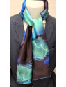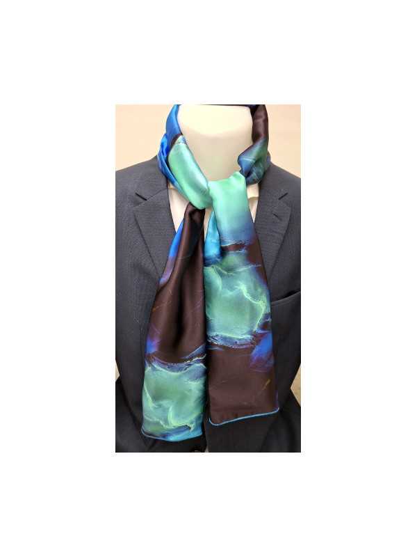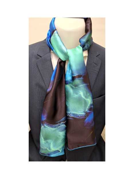 L’écharpe en soie "Abîmes Turquoises" invite à la contemplation d’un paysage aquatique profond.L'écharpe "Abîmes Turquoises" se révèle comme une peinture en mouvement, inspirée des profondeurs marines et de leurs jeux de lumière. Le motif tie and dye, à la fois fluide et structuré, unit les bleus électriques, les turquoises cristallins, les violets diffus et les verts minéraux dans une composition riche en nuances.