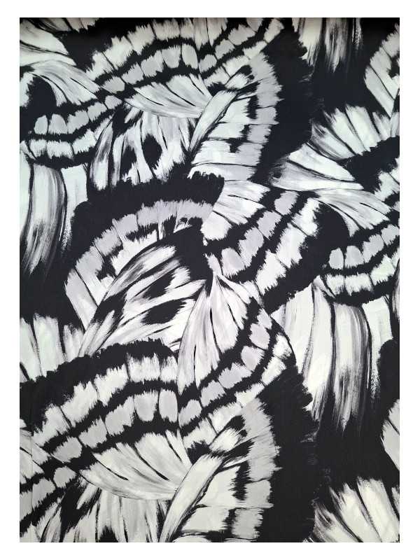 Battements d’Ébène » convoque les lignes organiques de la nature, inspirée du graphisme des ailes de papillons exotiques. Dans une palette bicolore sobre et puissante, les motifs s’entrelacent comme des coups de pinceau abstraits.