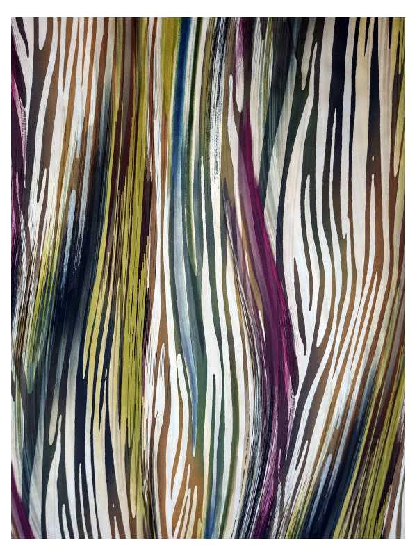 Les teintes se fondent et se superposent : vert mousse, brun acajou, ocre doré, beige lumineux et bordeaux éclatant s’enlacent dans un ballet de couleurs expressives. Ce motif ondulé offre une impression de mouvement perpétuel, à la fois énergique et enveloppant. Le jeu de transparences et de superpositions confère au tissu une profondeur captivante.