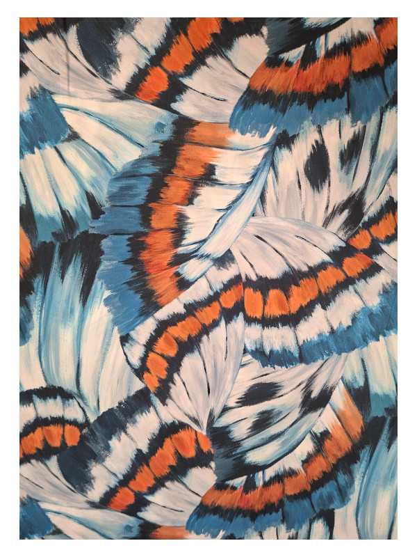 Éclatante et graphique, l’écharpe en soie "Papillon Boréal" déploie un motif d’ailes en plein vol, mêlant des nuances profondes de bleu nuit, de cuivre brûlé et d’ivoire. L’ensemble évoque un ballet de papillons figé dans la soie, avec une richesse chromatique saisissante et un contraste subtil entre lumière et mouvement. L’impression double face , de haute qualité sublime chaque détail des plumes, pour un rendu intense et raffiné. Un accessoire parfait pour illuminer une tenue sobre ou renforcer un style affirmé.