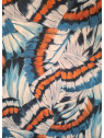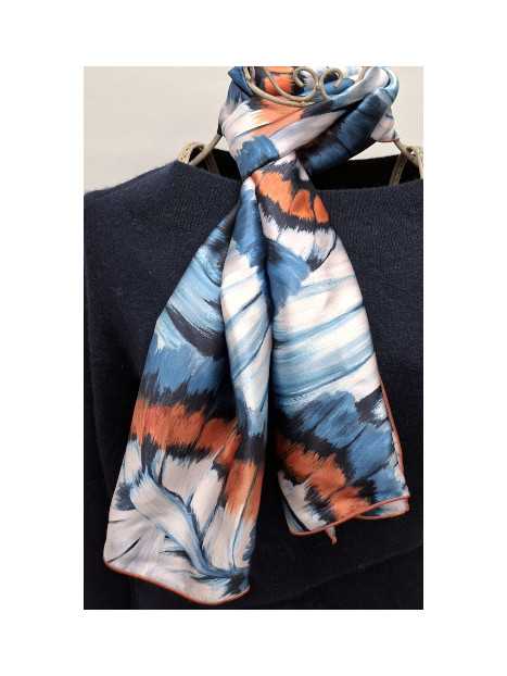 Chaque trait semble peint à la main tant l’impression est fine, précise et lumineuse. Grâce à une impression de haute qualité, les couleurs conservent leur éclat, tandis que la texture lisse et douce de la soie naturelle les magnifie sous tous les angles. À la lumière, l’écharpe vibre délicatement, mettant en valeur les motifs aux allures de plumes.