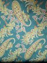 Son vert tendre, légèrement bleuté, installe une atmosphère apaisée et noble. Le motif cachemire se développe comme un feuillage stylisé, rehaussé de touches jaunes, rose pâle et ivoire, pour une composition riche sans excès.